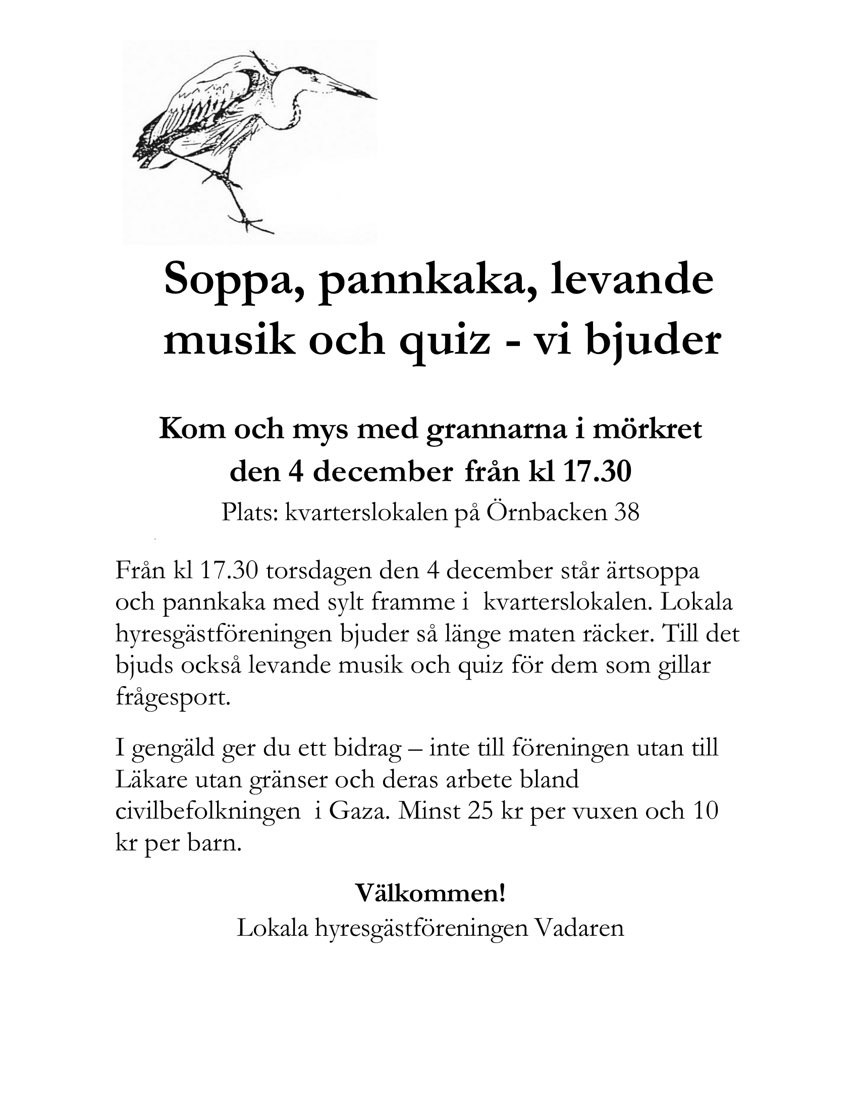 Kvarterslokalen på Örnbacken 38 är en fin tillgång för oss som bor i kvarteret Vadaren. Där hålls bostadsmöten och soppkvällar, regelbundna aktiviteter som yoga och privata tillställningar som barnkalas och studentmottagningar. För att inte tala om möjligheten att spela pingis där.